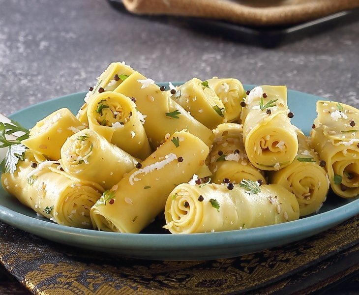 Surali Wadi is a soft fluffy roll made with gram flour, yoghurt and basic spices.
